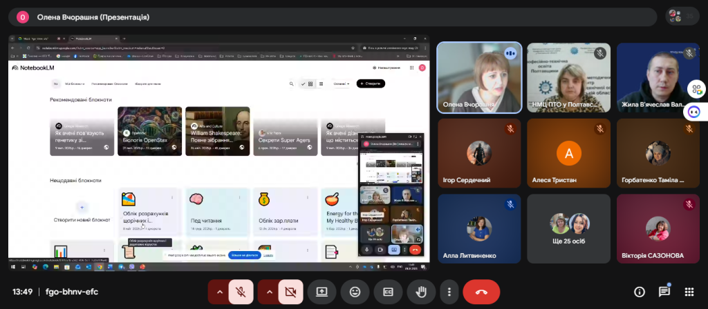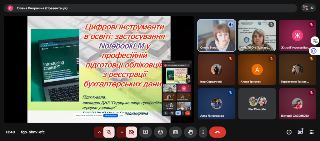 🔹 Олена Вчорашня, викладач ДНЗ «Гадяцьке вище професійне аграрне училище», презентувала тему щодо використання цифрових інструментів в освіті, зокрема застосування NotebookLM у професійній підготовці обліковців з реєстрації бухгалтерських даних.
